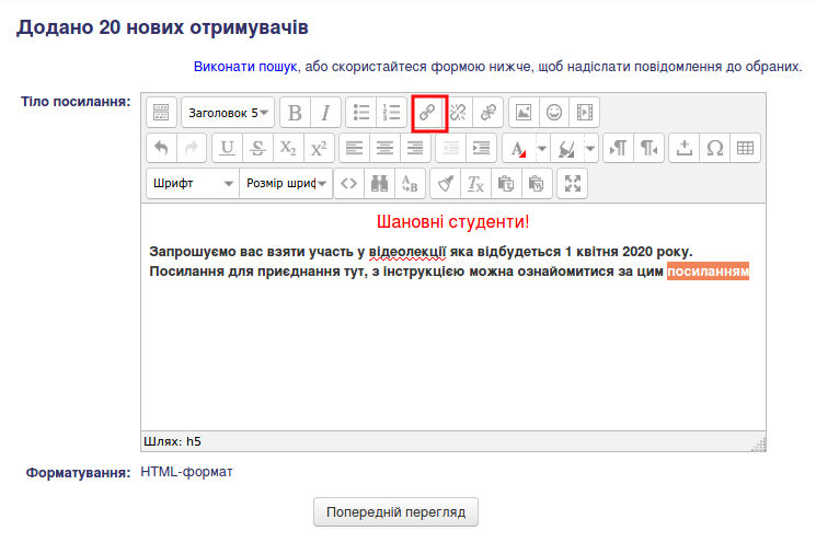Якщо є необхідність додати до повідомлення посилання на інші ресурси (файли на хмарних сервісах, веб конференції, відео на Youtube та ін.) треба виконати наступне.