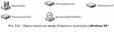 алфавіту і двокрапку після неї. Наприклад, А:, В:, С:, D:. Літери А і В зарезервовані для позначення накопичувачів на гнучких магнітних дисках. Якщо комп’ютер не має одного або обох цих накопичувачів, то відповідні літери не використовуються. На рисунку 3.31 наведено приклади значків, які позначають зовнішні запам’ятовуючі пристрої різних видів.